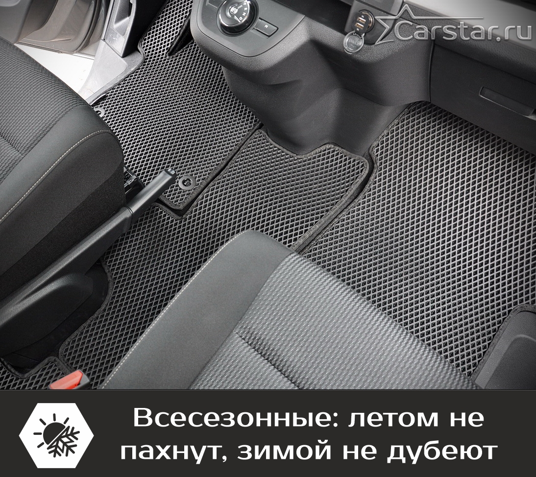 Коврики EVA всесезонные. Их можно использовать зимой, так как они не трескаются на морозе и остаются пластичными до -50 °С. А также летом, так как они не выделяют запаха на жаре до +50 °С. Зимой коврики спокойно выдерживают контакт с дорожными реагентами. Материал абсолютно непромокаемый. Ячеистая структура коврика эффективно собирает снег, грязь, песок, пыль круглый год.