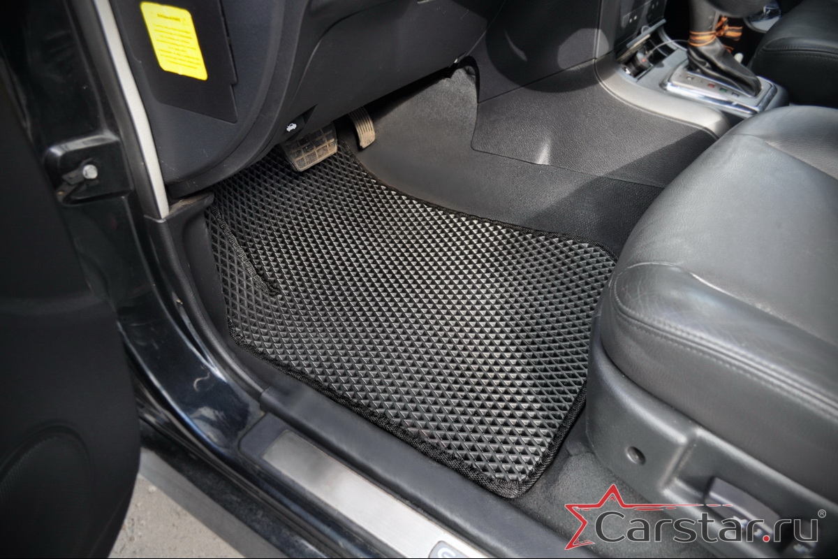 Толщина ковриков EVA составляет 10-12 мм. Глубина ячеек 7-8 мм. Такая толщина ковриков позволяет им служить довольно долго, не протираясь до 3 лет. А благодаря такой глубине ячеек коврик EVA площадью 1 кв.м. способен захватить около 3,5 л жидкости, сохраняя в чистоте вашу обувь и обивку салона.