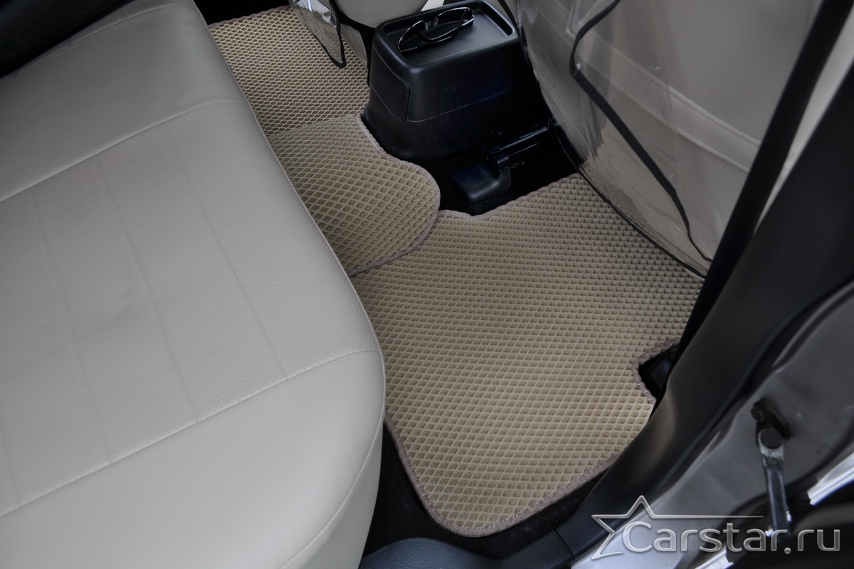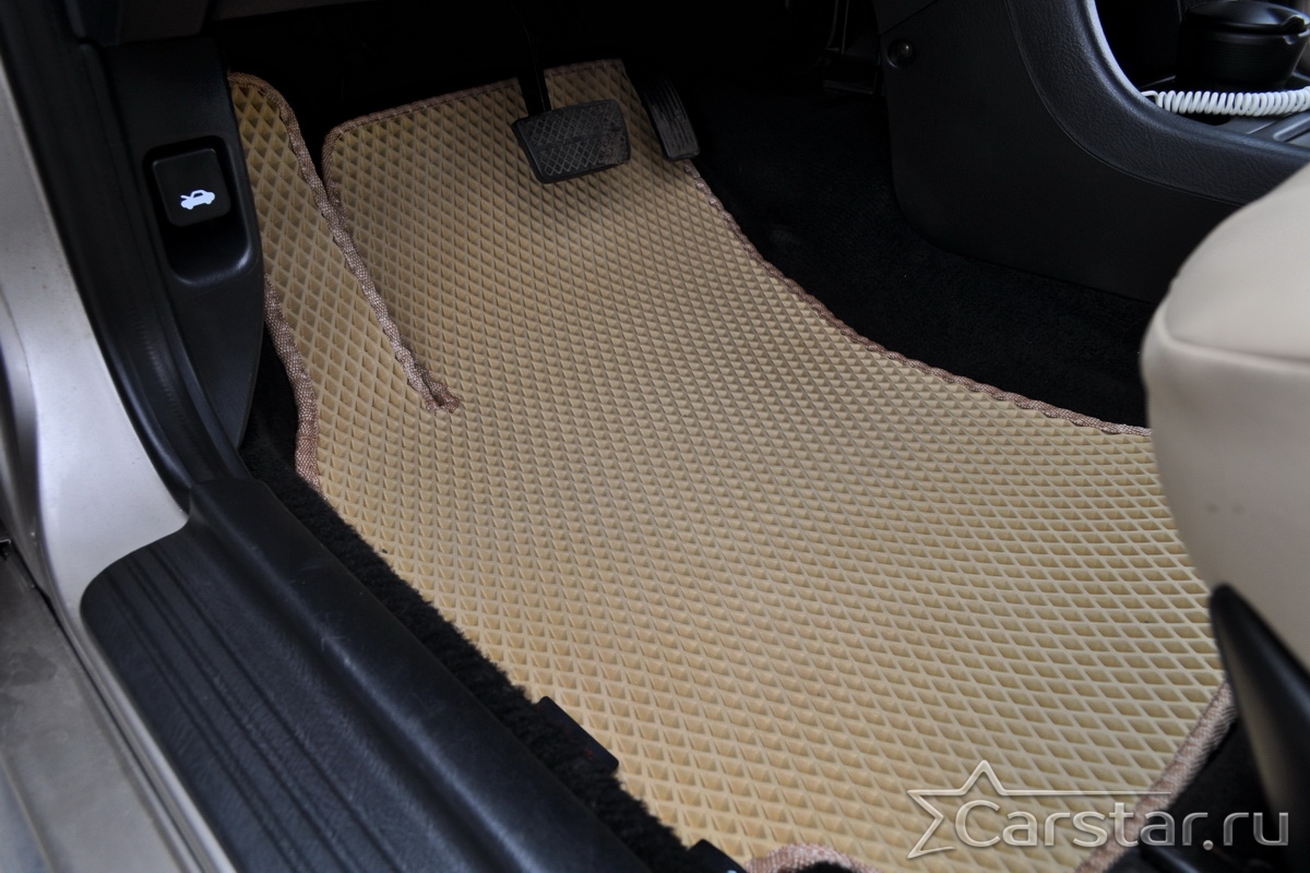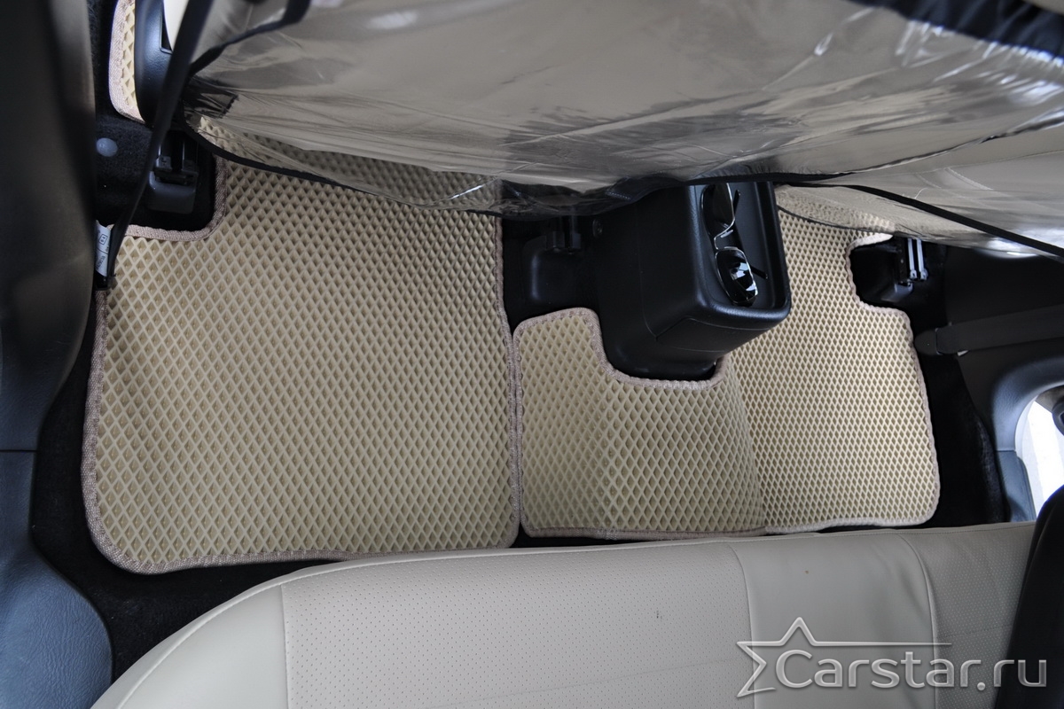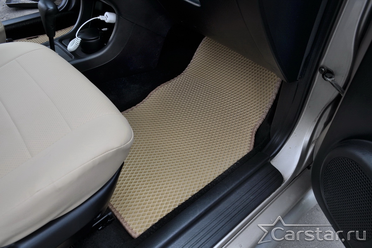 Толщина ковриков EVA составляет 10-12 мм. Глубина ячеек 7-8 мм. Такая толщина ковриков позволяет им служить довольно долго, не протираясь до 3 лет. А благодаря такой глубине ячеек коврик EVA площадью 1 кв.м. способен захватить около 3,5 л жидкости, сохраняя в чистоте вашу обувь и обивку салона.