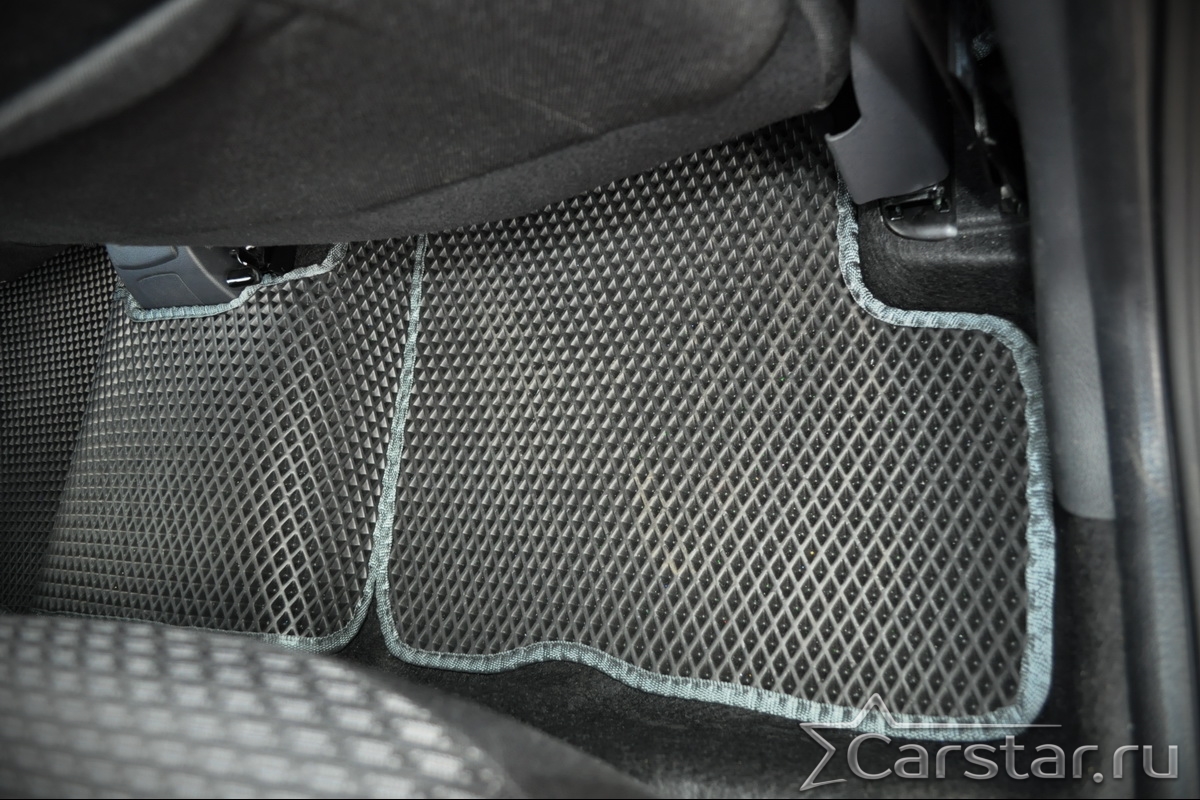 Толщина ковриков EVA составляет 10-12 мм. Глубина ячеек 7-8 мм. Такая толщина ковриков позволяет им служить довольно долго, не протираясь до 3 лет. А благодаря такой глубине ячеек коврик EVA площадью 1 кв.м. способен захватить около 3,5 л жидкости, сохраняя в чистоте вашу обувь и обивку салона.