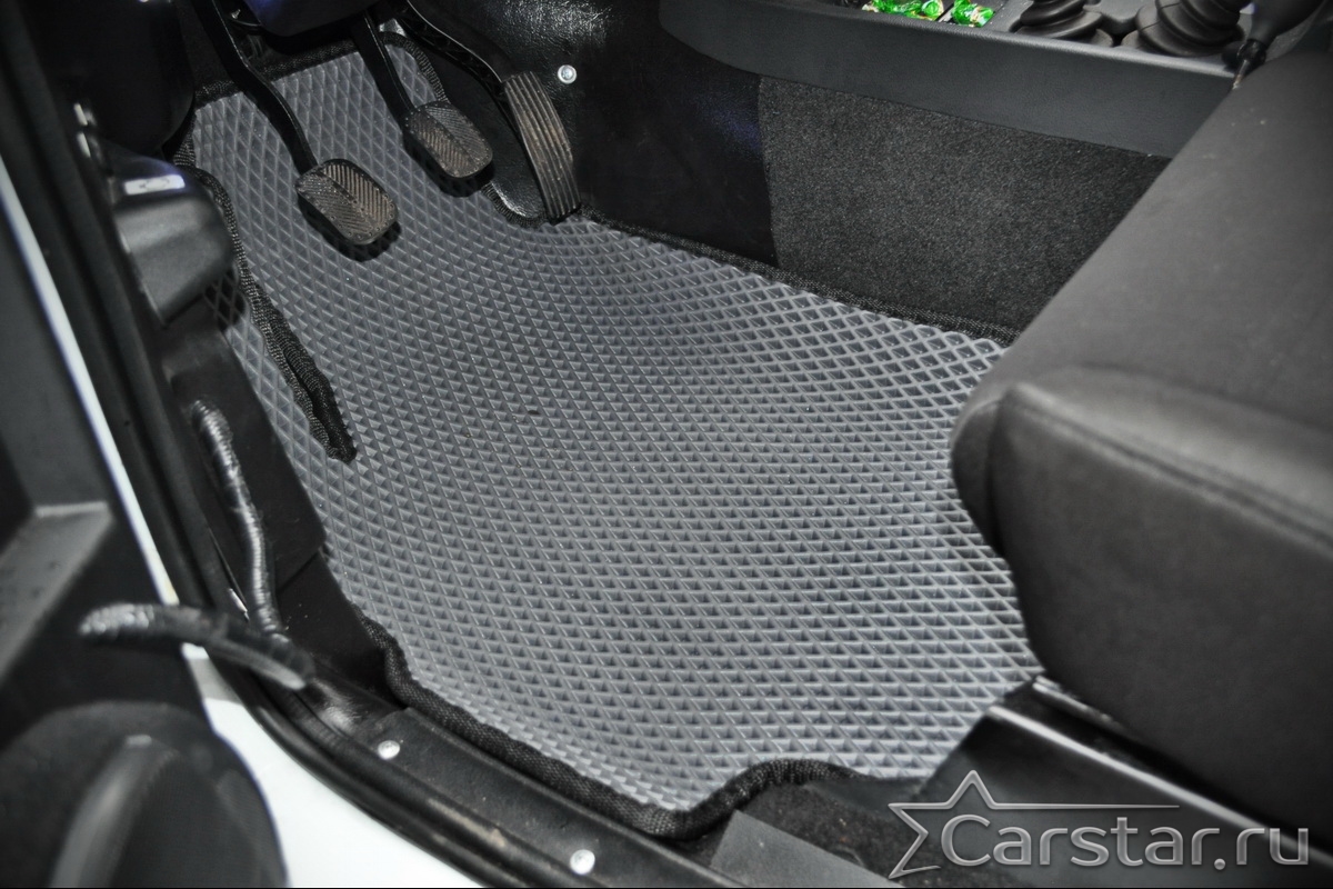 Толщина ковриков EVA составляет 10-12 мм. Глубина ячеек 7-8 мм. Такая толщина ковриков позволяет им служить довольно долго, не протираясь до 3 лет. А благодаря такой глубине ячеек коврик EVA площадью 1 кв.м. способен захватить около 3,5 л жидкости, сохраняя в чистоте вашу обувь и обивку салона.
