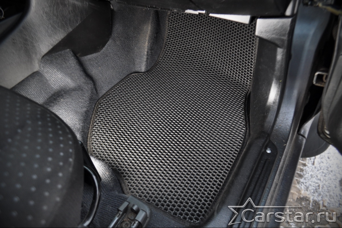 Толщина ковриков EVA составляет 10-12 мм. Глубина ячеек 7-8 мм. Такая толщина ковриков позволяет им служить довольно долго, не протираясь до 3 лет. А благодаря такой глубине ячеек коврик EVA площадью 1 кв.м. способен захватить около 3,5 л жидкости, сохраняя в чистоте вашу обувь и обивку салона.