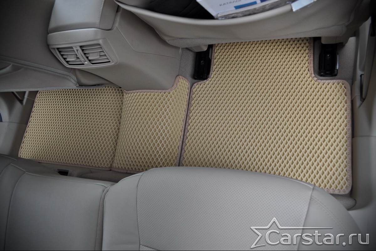 Толщина ковриков EVA составляет 10-12 мм. Глубина ячеек 7-8 мм. Такая толщина ковриков позволяет им служить довольно долго, не протираясь до 3 лет. А благодаря такой глубине ячеек коврик EVA площадью 1 кв.м. способен захватить около 3,5 л жидкости, сохраняя в чистоте вашу обувь и обивку салона.