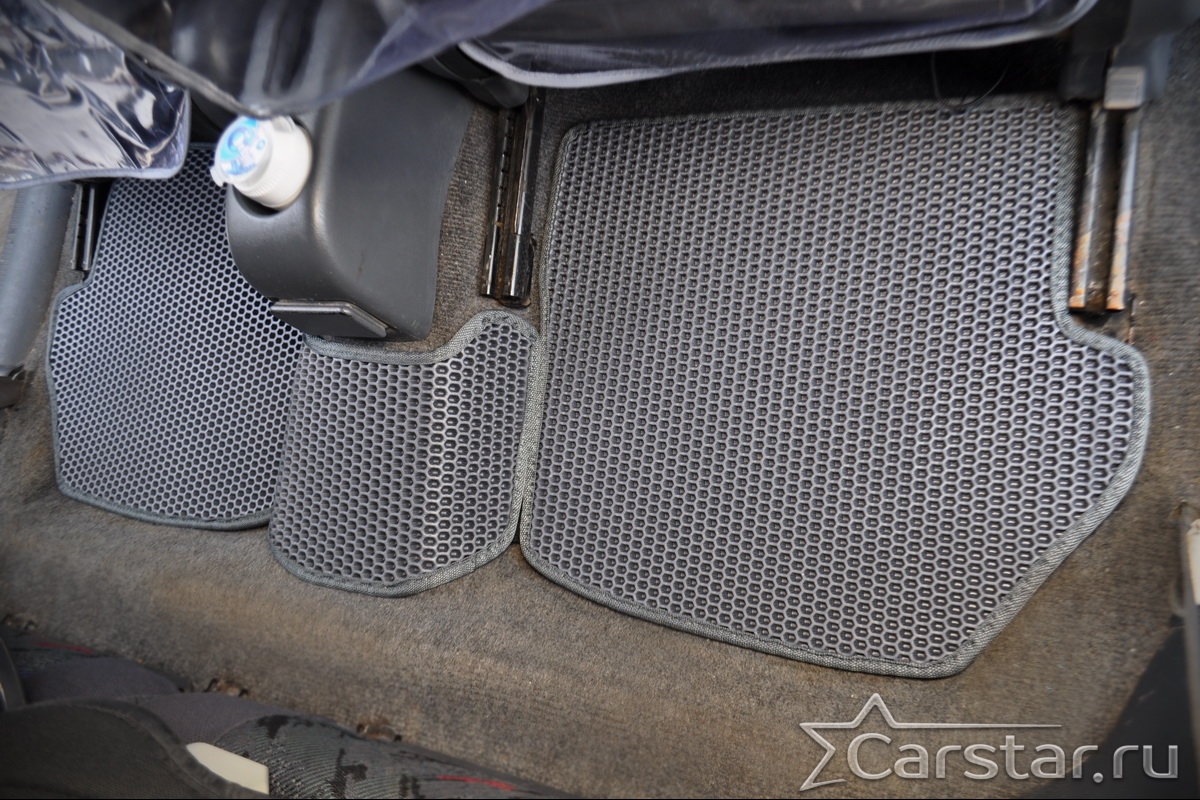 Толщина ковриков EVA составляет 10-12 мм. Глубина ячеек 7-8 мм. Такая толщина ковриков позволяет им служить довольно долго, не протираясь до 3 лет. А благодаря такой глубине ячеек коврик EVA площадью 1 кв.м. способен захватить около 3,5 л жидкости, сохраняя в чистоте вашу обувь и обивку салона.