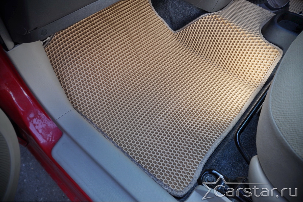 Толщина ковриков EVA составляет 10-12 мм. Глубина ячеек 7-8 мм. Такая толщина ковриков позволяет им служить довольно долго, не протираясь до 3 лет. А благодаря такой глубине ячеек коврик EVA площадью 1 кв.м. способен захватить около 3,5 л жидкости, сохраняя в чистоте вашу обувь и обивку салона.