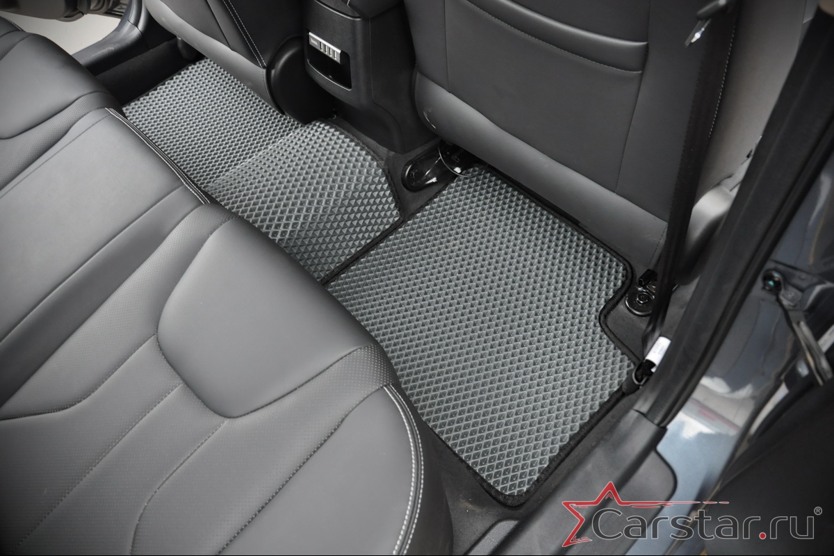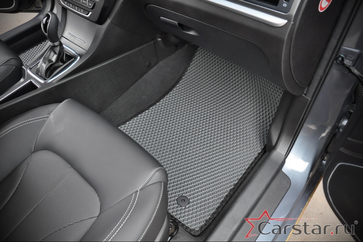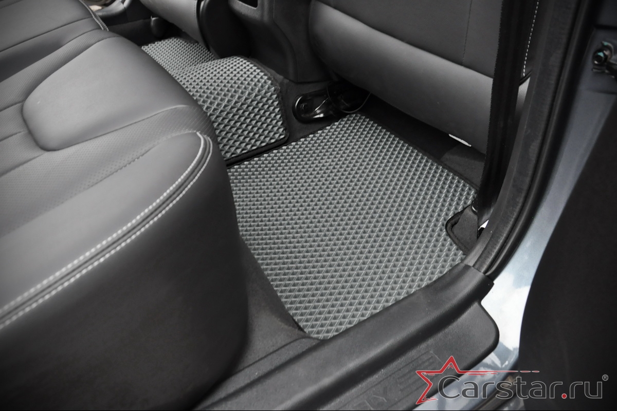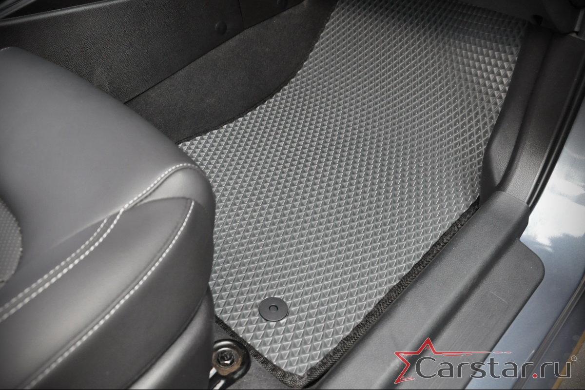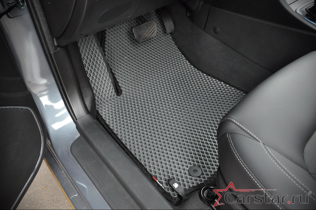 Текстильные коврики надёжно крепятся с помощью оригинальных систем фиксации. Обратная сторона имеет противоскользящее покрытие, что обеспечивает защиту от смещений и безопасность. Максимальное удобство достигается точными лекалами.
