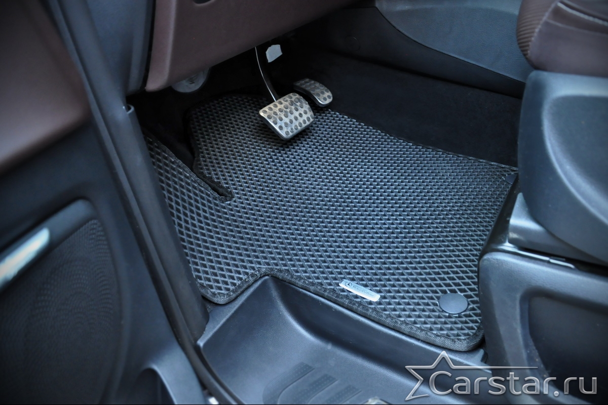 Текстильные коврики надёжно крепятся с помощью оригинальных систем фиксации. Обратная сторона имеет противоскользящее покрытие, что обеспечивает защиту от смещений и безопасность. Максимальное удобство достигается точными лекалами.