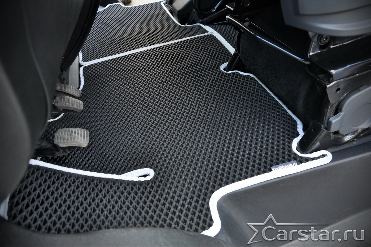 Текстильные коврики надёжно крепятся с помощью оригинальных систем фиксации. Обратная сторона имеет противоскользящее покрытие, что обеспечивает защиту от смещений и безопасность. Максимальное удобство достигается точными лекалами.